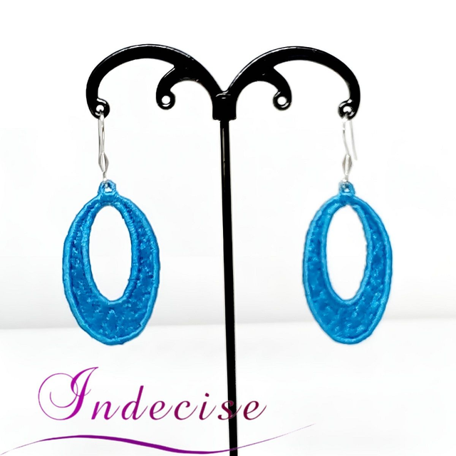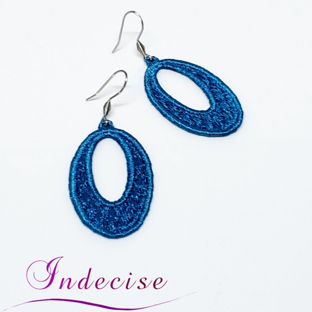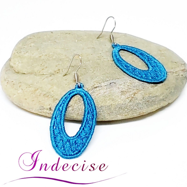 Boucles d'oreilles bleu métal, broderie en machine - Création indecise
