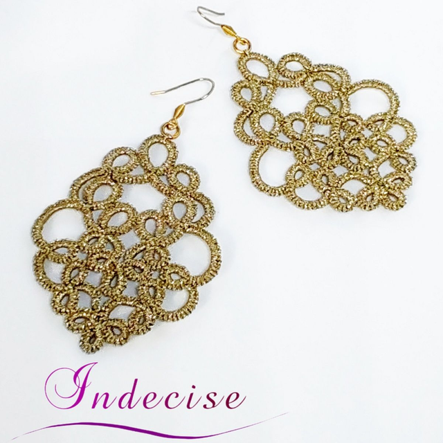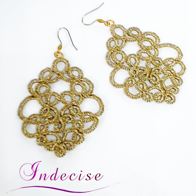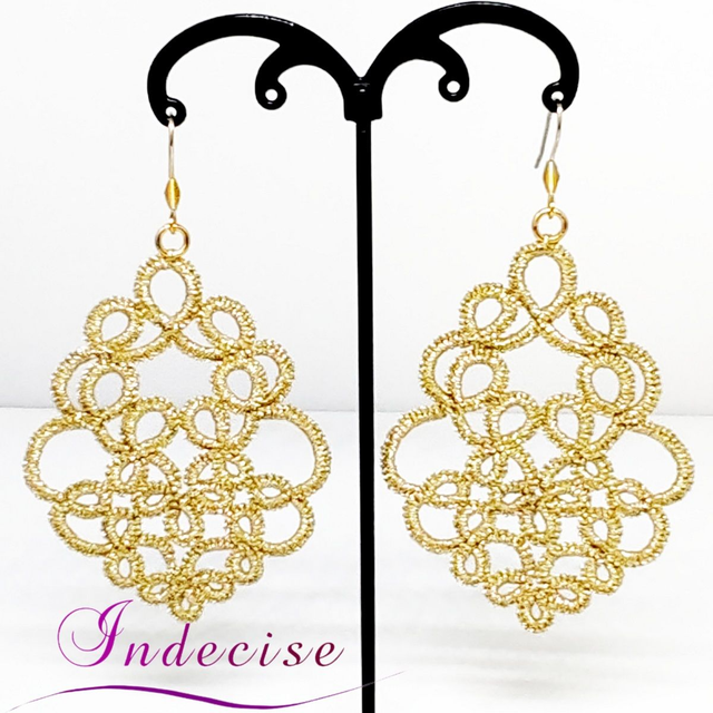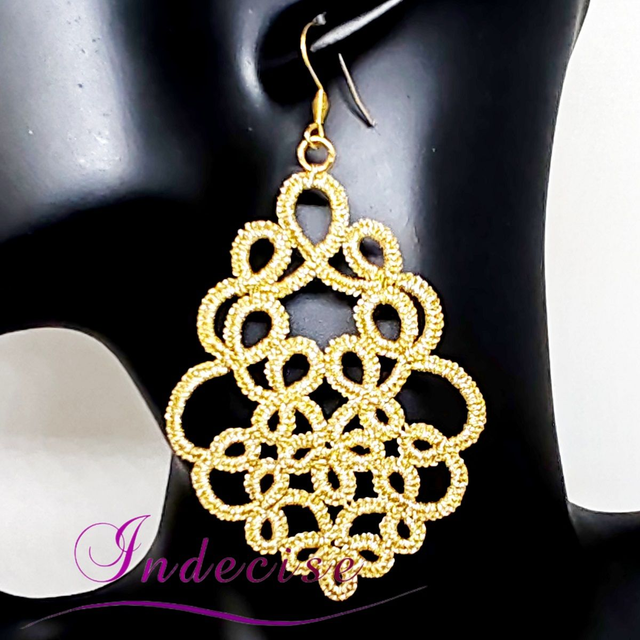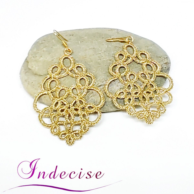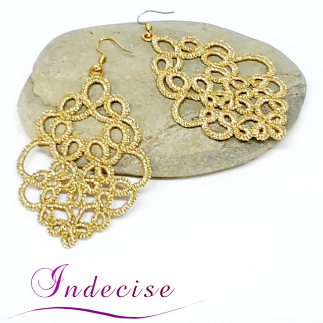 Boucles d'oreilles couleur or, en dentelle à l'aiguille (frivolité)