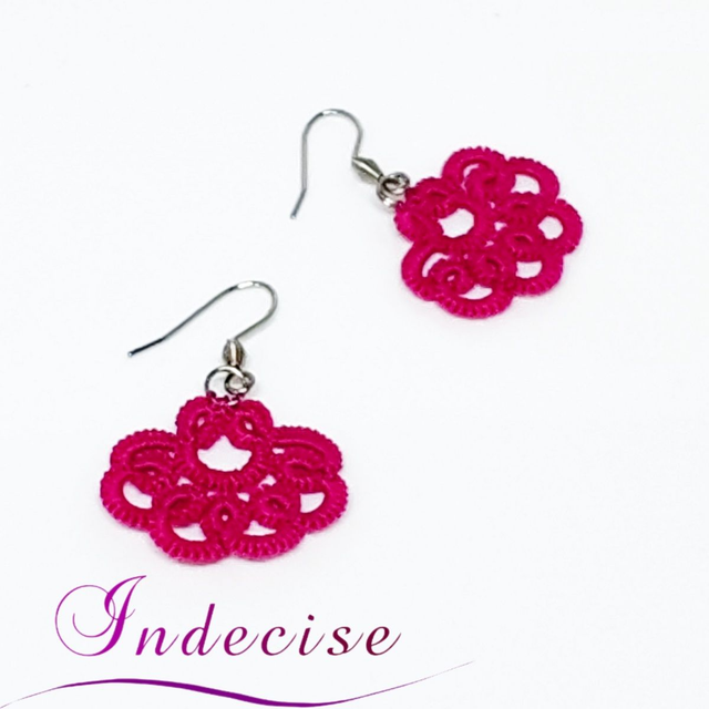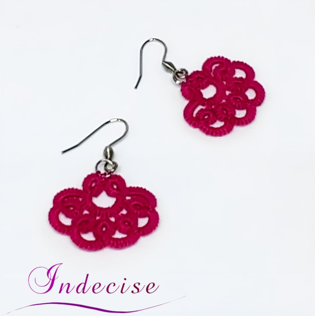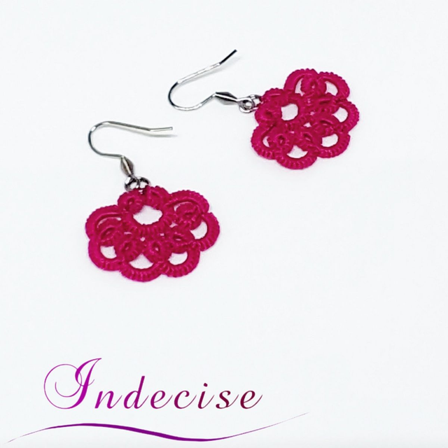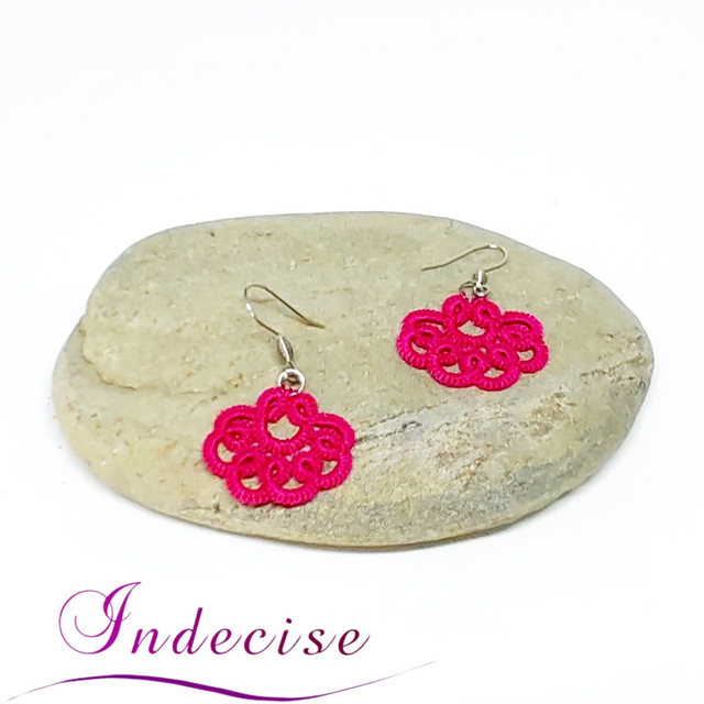 Boucles d'oreilles petit éventail fuchsia, en dentelle à l'aiguille, avec crochets en acier inoxydable (hypoallergénique)