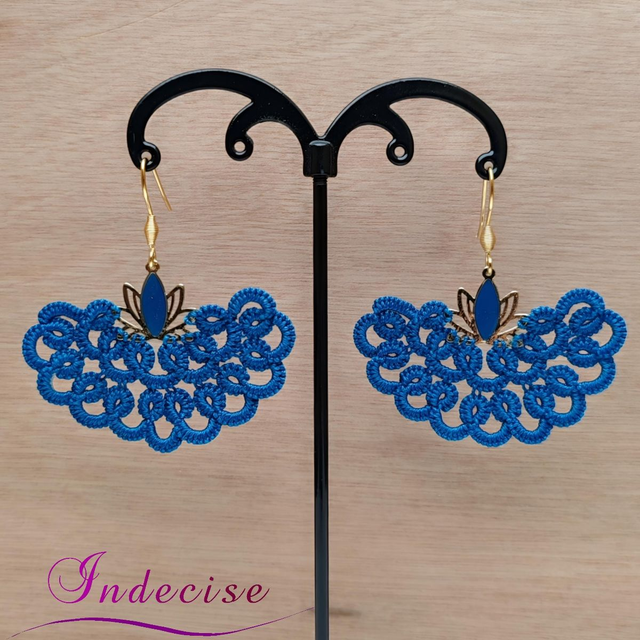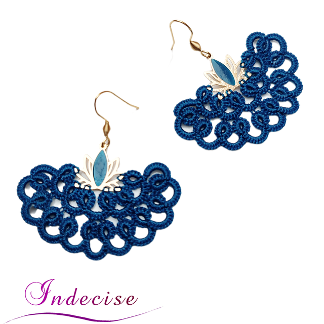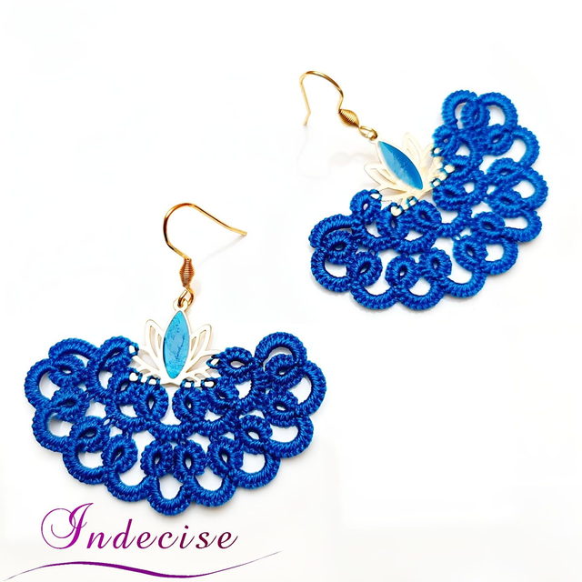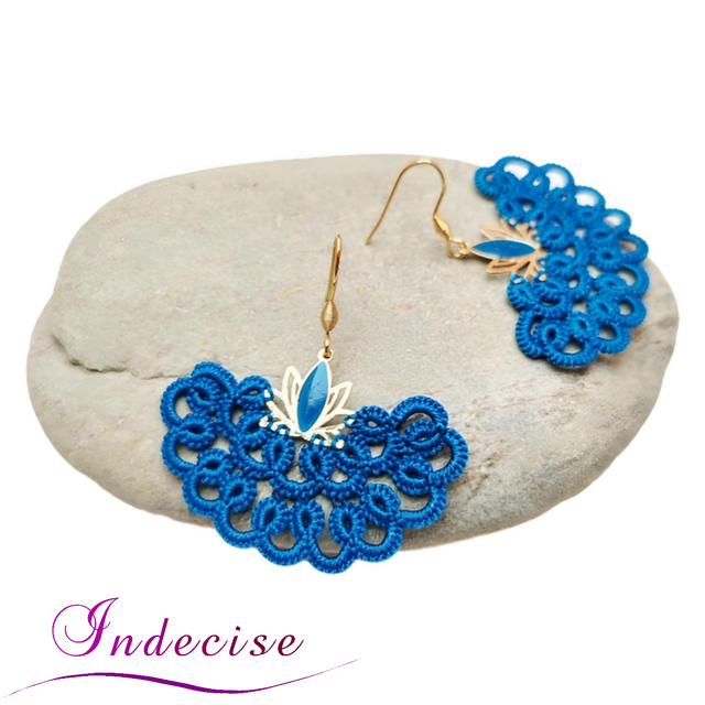 Boucles d'oreilles bleues, en dentelle à l'aiguille, avec crochets en acier 316L (hypoallergénique, inoxydable et sans nickel) plaqué or