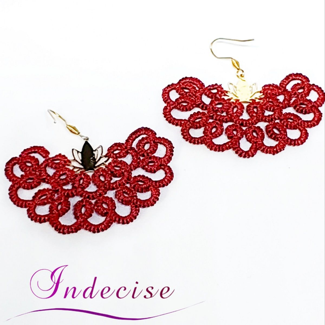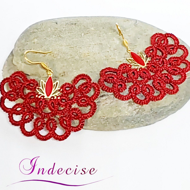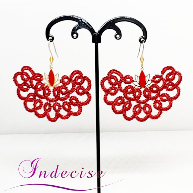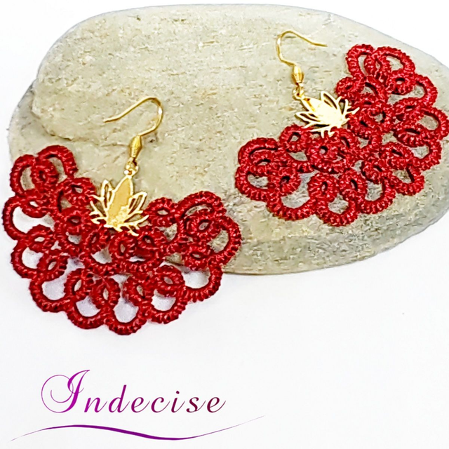 Boucles d'oreilles éventail rouge, en dentelle à l'aiguille (frivolité) - Crochets en acier 316L inoxydable plaqué or (hypoallergénique)
