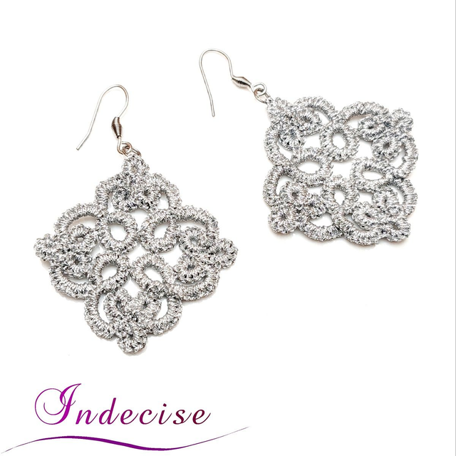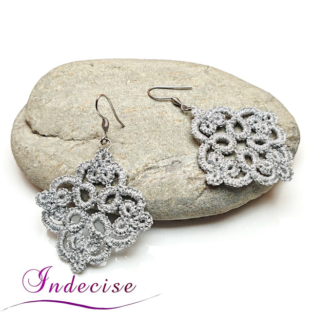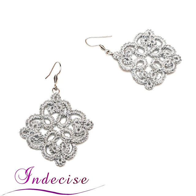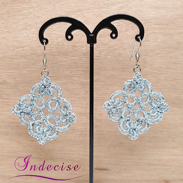 Boucles d'oreilles losanges argent, en dentelle à l'aiguille (frivolité)
