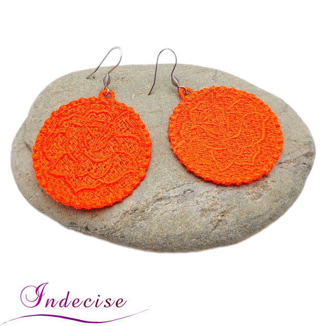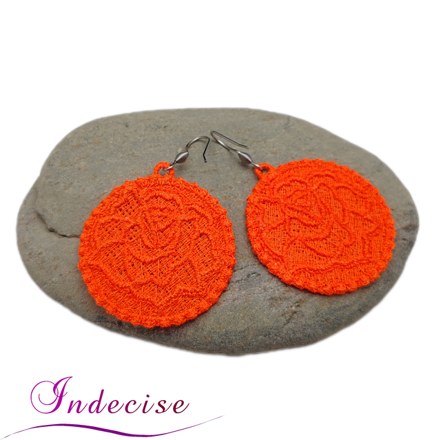 Boucles d'oreilles orange vif, broderie en machine relief de rose de rose - Création Indecise