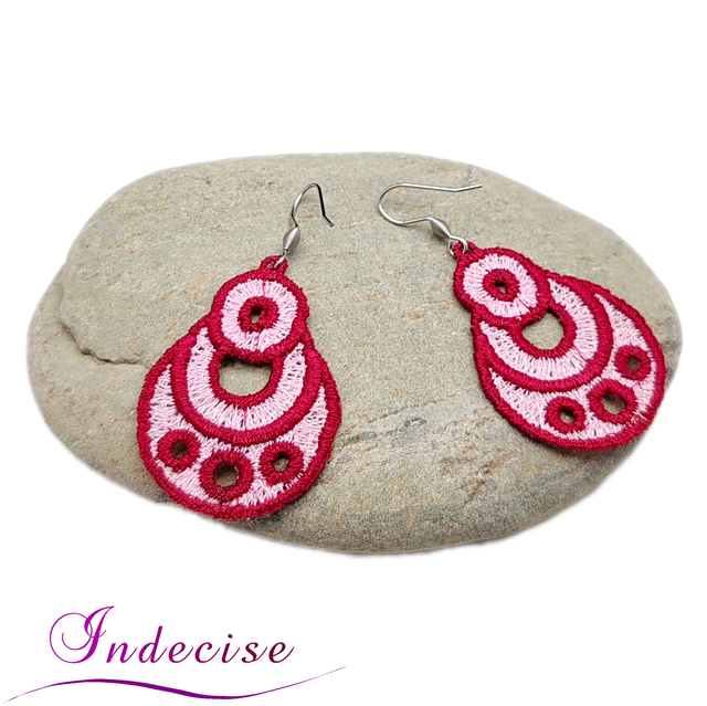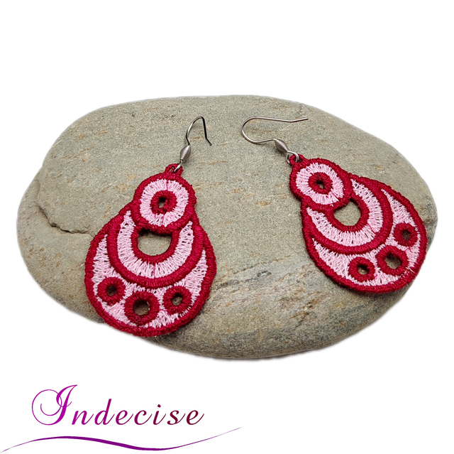 Boucles d'oreilles rose et bordeaux, broderie en machine - Créations issues de l'artisanat français par Indecise