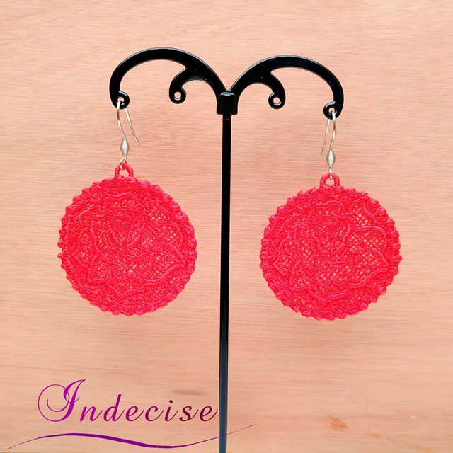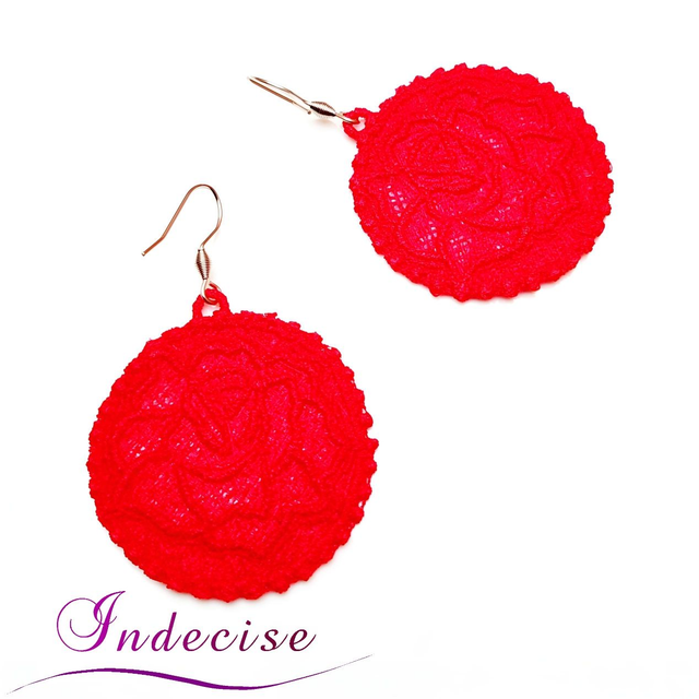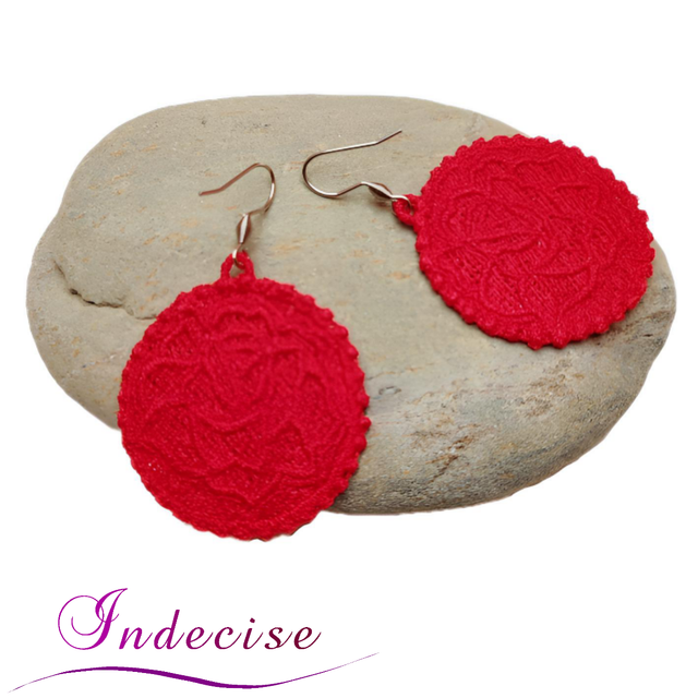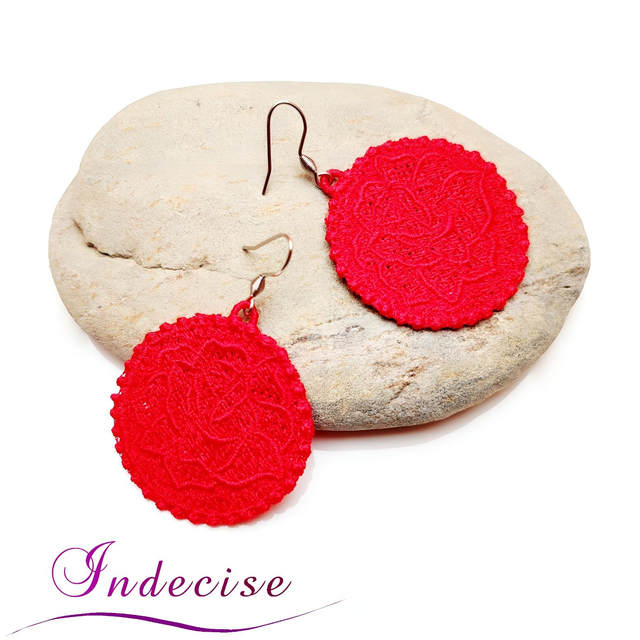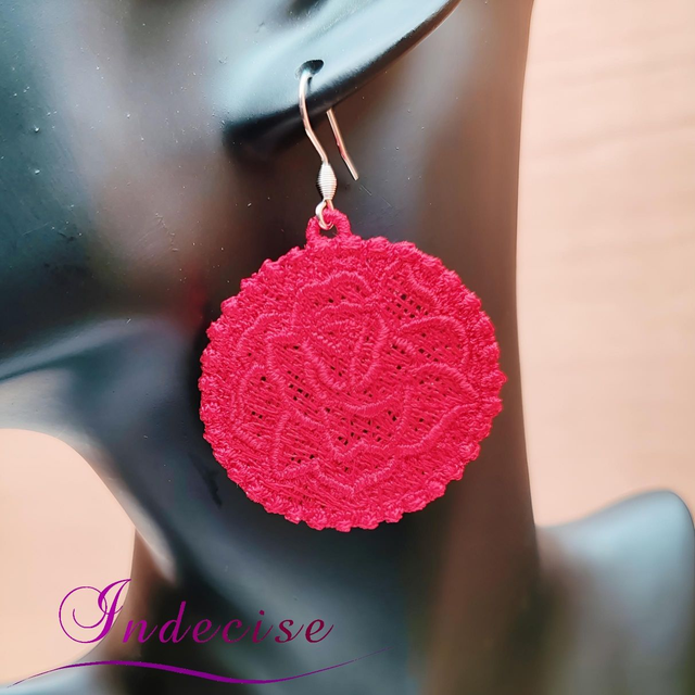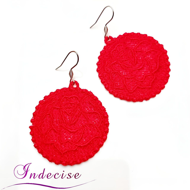 Boucles d'oreilles rouge, broderie en machine forme de rose - Création Indecise