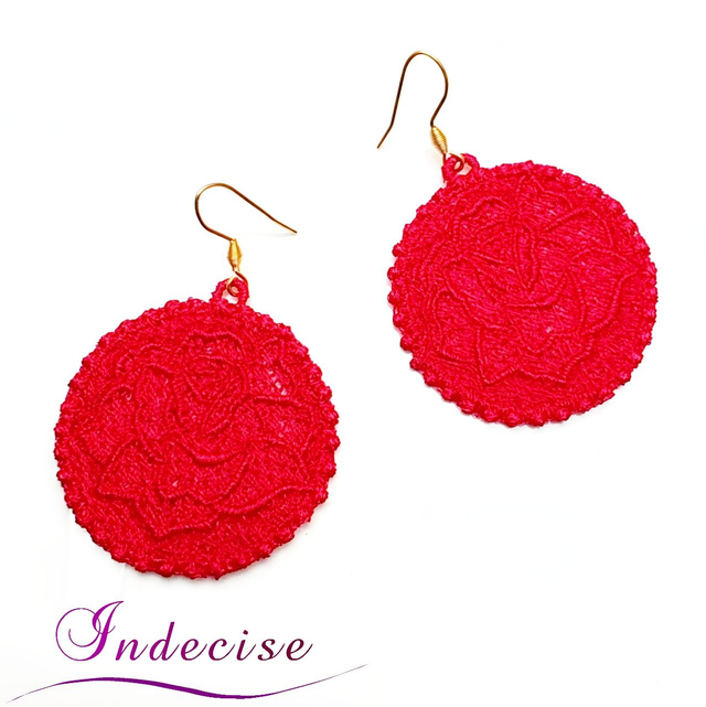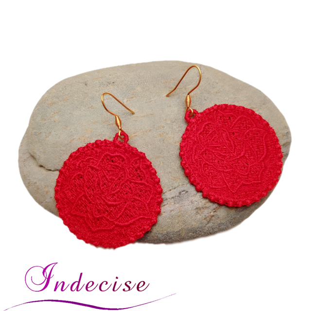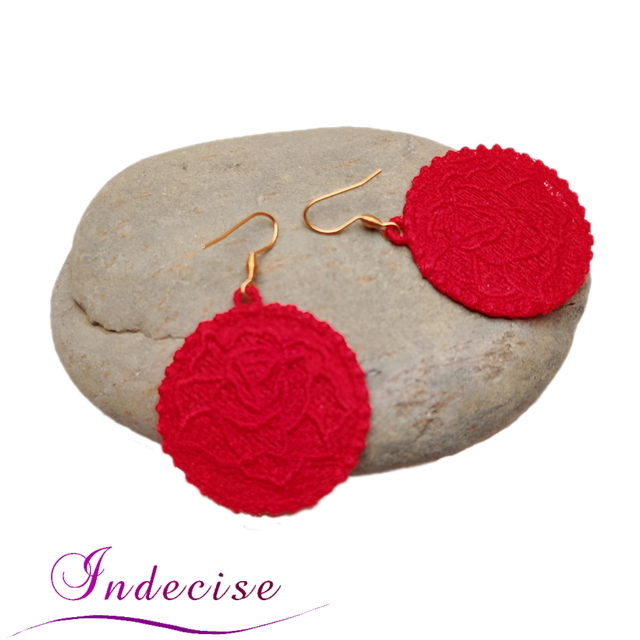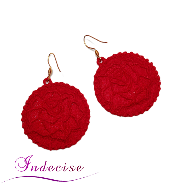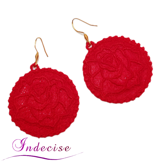 Boucles d'oreilles rouge, broderie en machine forme de rose - Création Indecise