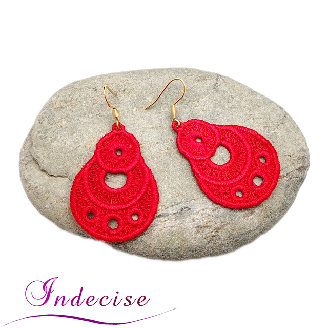 Boucles d'oreilles rouge vif, cercles enlacés, broderie en machine - Création Indecise