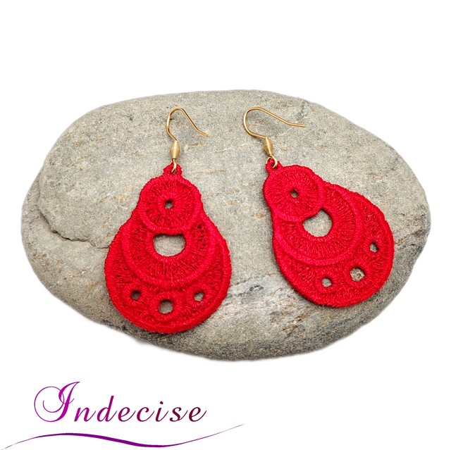 Boucles d'oreilles rouge vif, broderie en machine - Créations issues de l'artisanat français par Indecise
