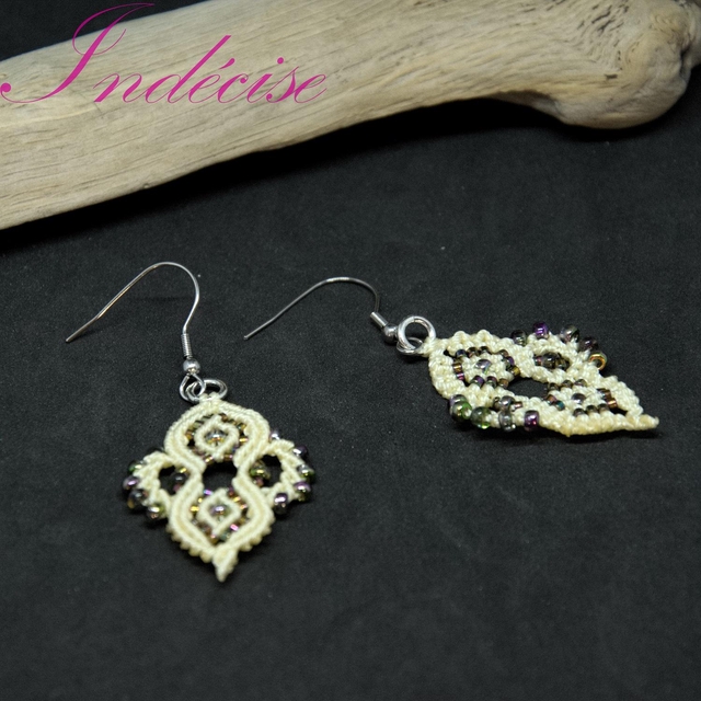 Boucles d'oreilles en macramé vanille et perles orchidée, crochet en acier inoxydable - Créations UNIQUES Indecise