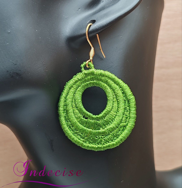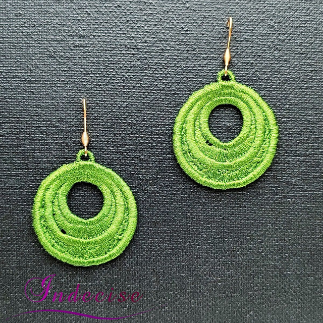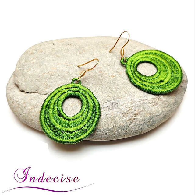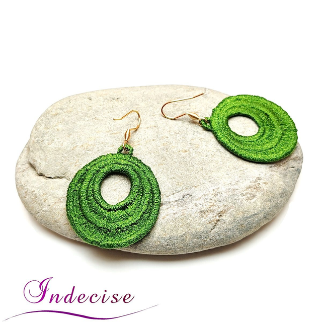 Boucles d'oreilles vert kaki clair, broderie en machine - Création Indecise