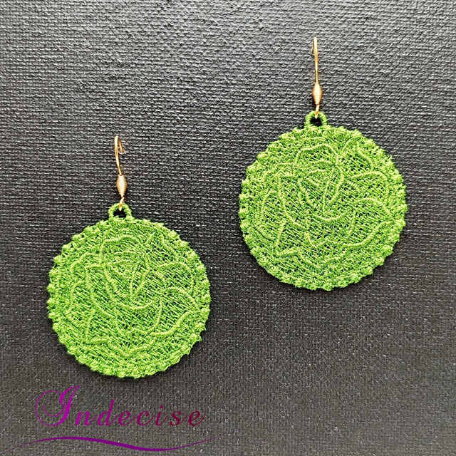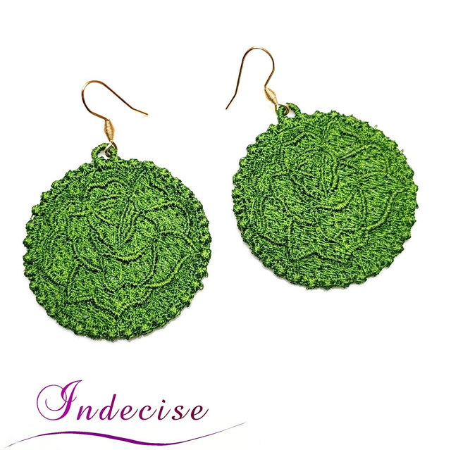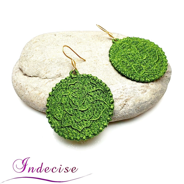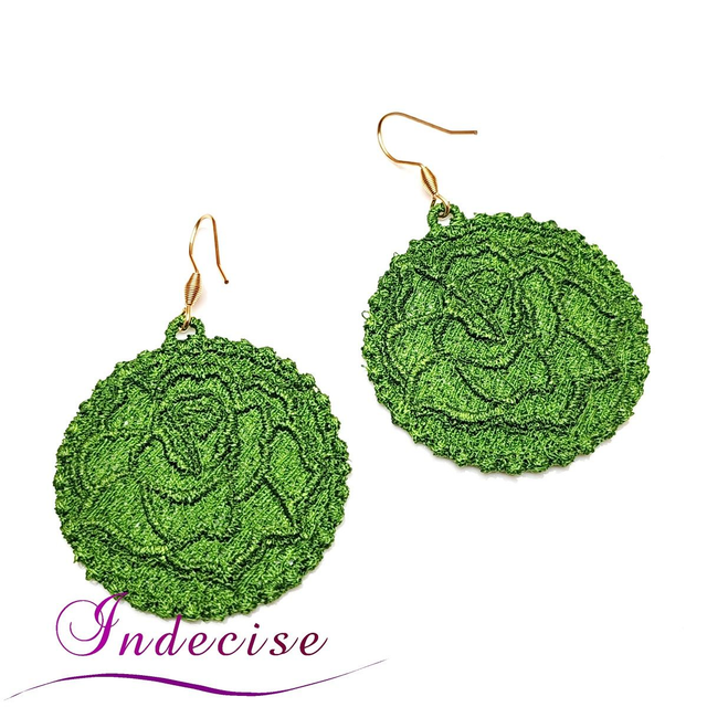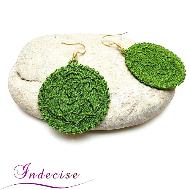 Boucles d'oreilles vert kaki clair, broderie en machine forme de rose - Création Indecise
