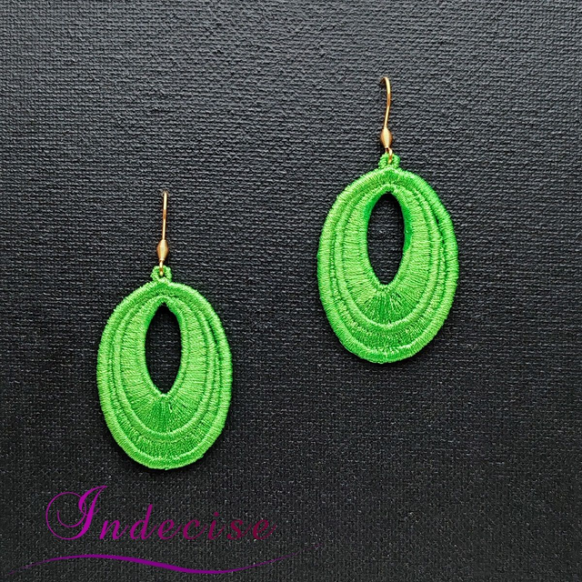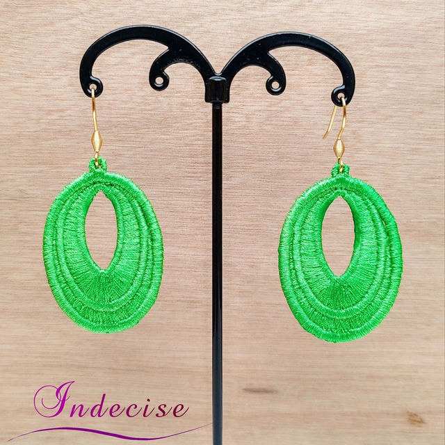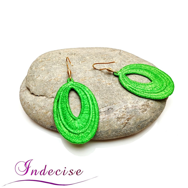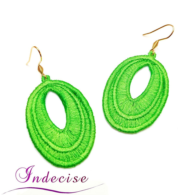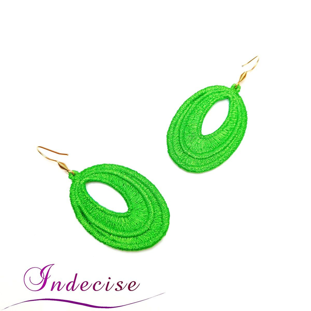 Boucles d'oreilles vert vif, broderie en machine - Créations issues de l'artisanat français par Indecise
