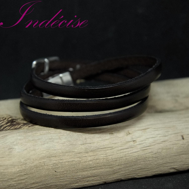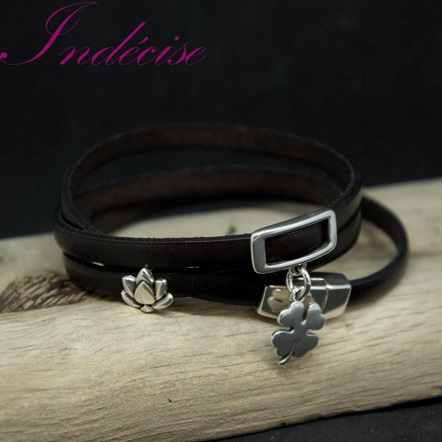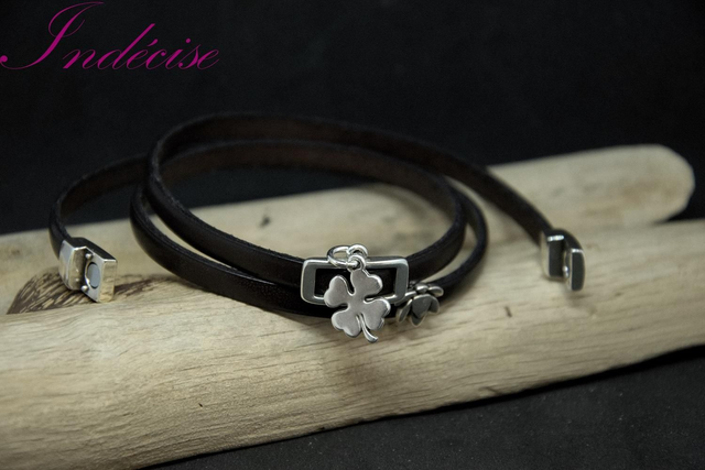 Bracelet trois tours en cuir marron, avec fermoir aimanté et pendentif trèfle - Création UNIQUE Indecise - Tour de poignet de 15 à 16,5 cm