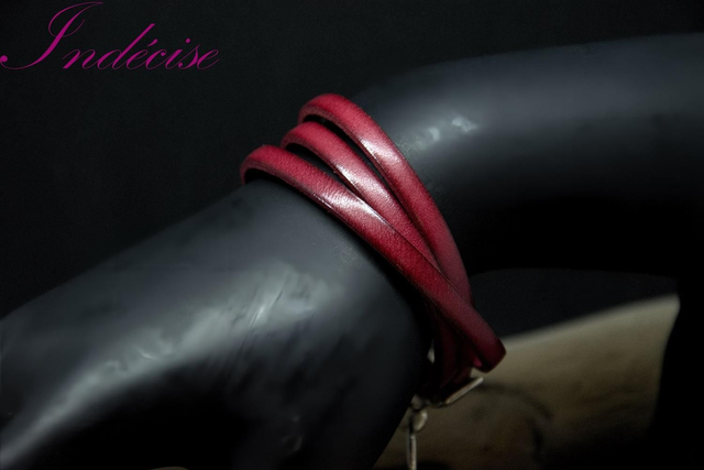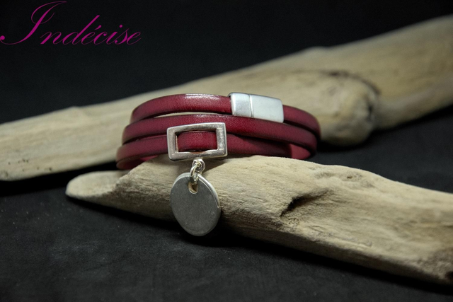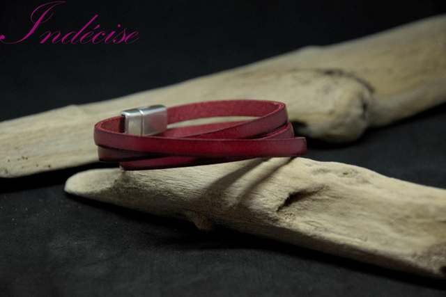 Bracelet trois tours en cuir rouge cerise avec fermoir aimanté - Création UNIQUE Indecise - Tour de poignet de 15 à 16,5 cm