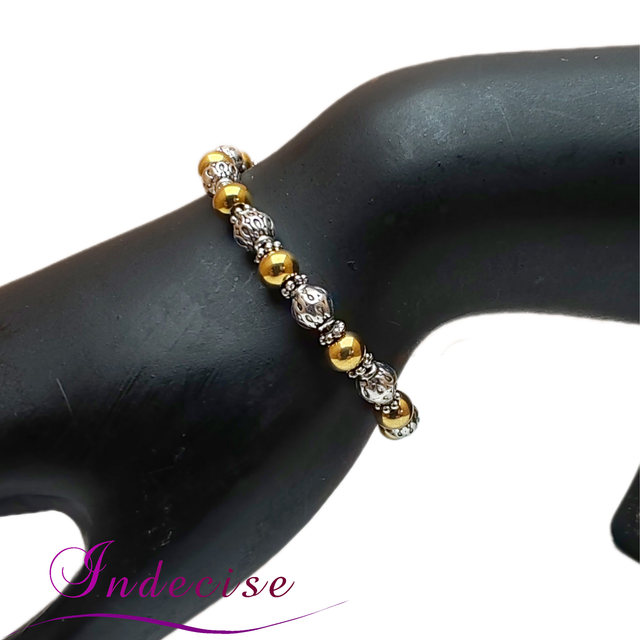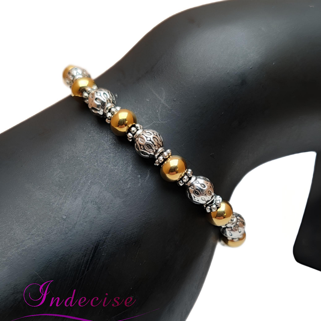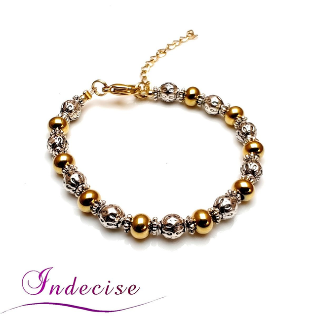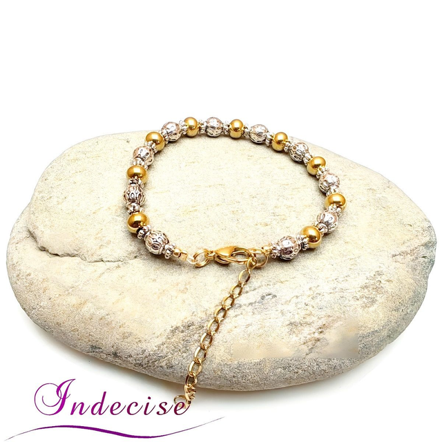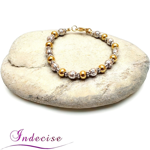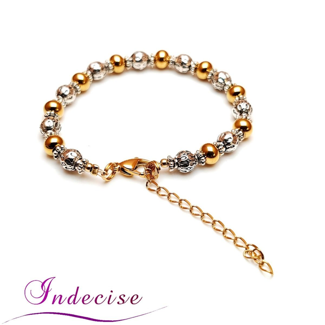 Bracelet en perles style tibétain couleur or et argent. Perles en acier plaqué or et perles tibétaines. Fermoir et chaînette d'ajustement en acier inoxydable plaqué or, câble de montage de 0,7 mm en acier.