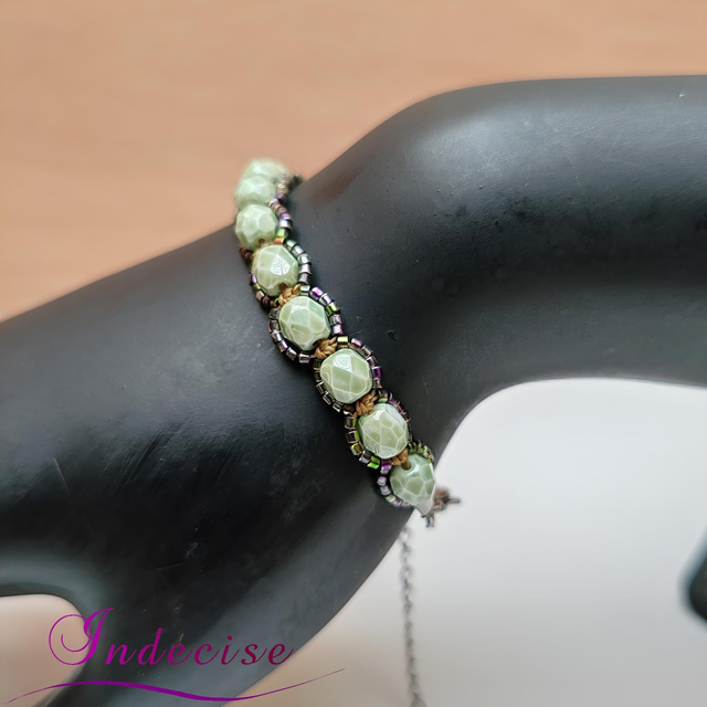Bracelet ajustable en perles de verre vert clair et perles métal irisé