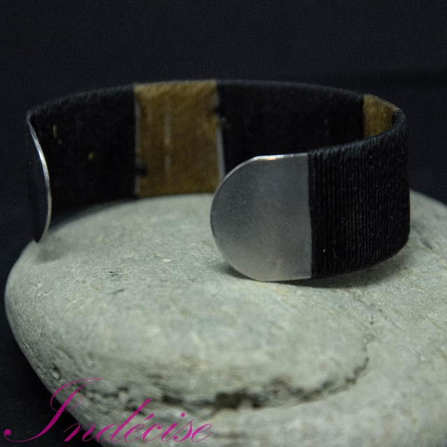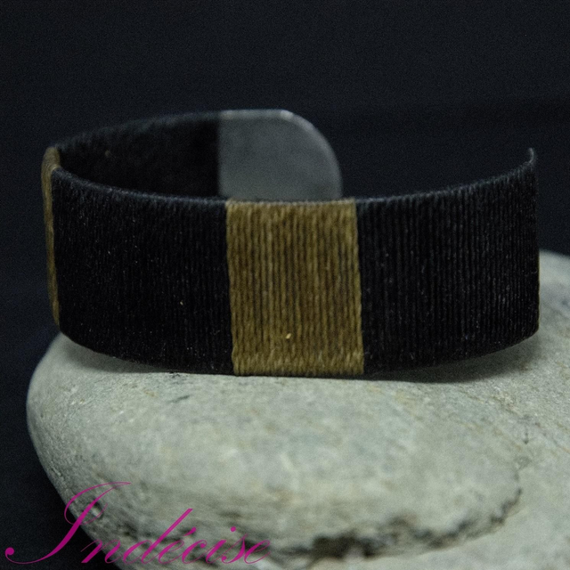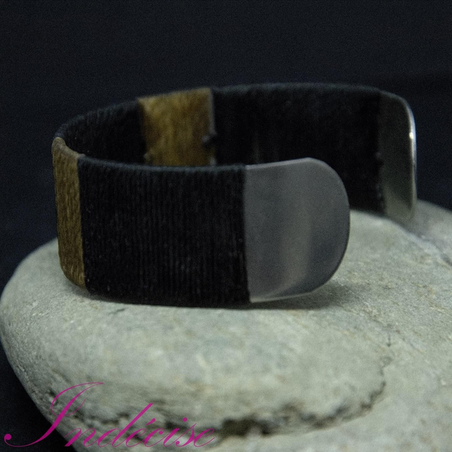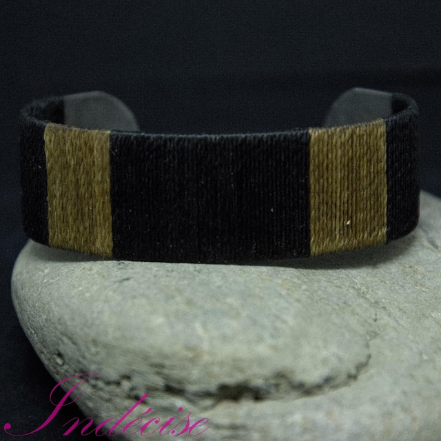 Bracelet en acier inoxydable (hypoallergénique), jonc avec fil de polyester marron et or.