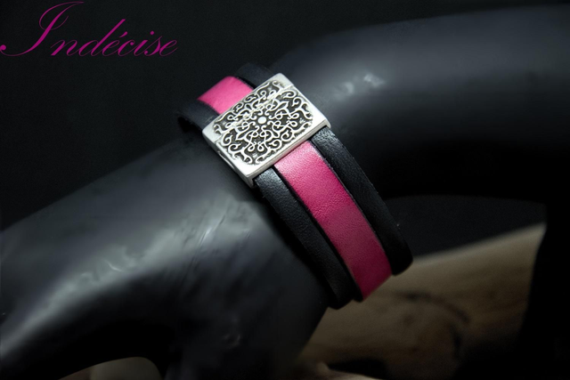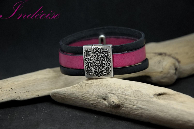 Bracelet en cuir noir et rose - Fermoir ethnique aimanté en zamak (inoxydable, hypoallergénique) - Indecise, créatrice française