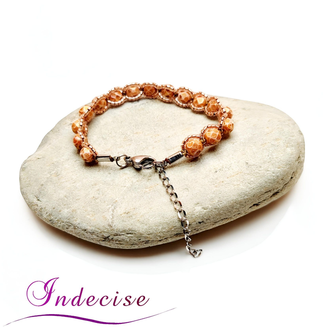 Bracelet perles de verre ocre et perles cuivre, fermoir acier - Création Indecise