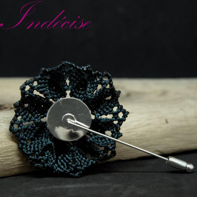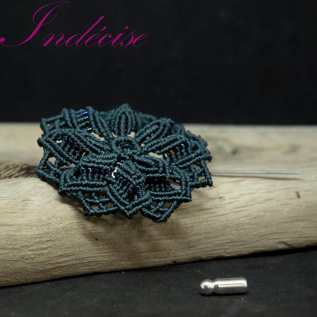 Broche mandala en macramé bleu pétrole avec perles cristal bleu sombre irisé - diamètre : 5 cm environ - Création UNIQUE Indecise