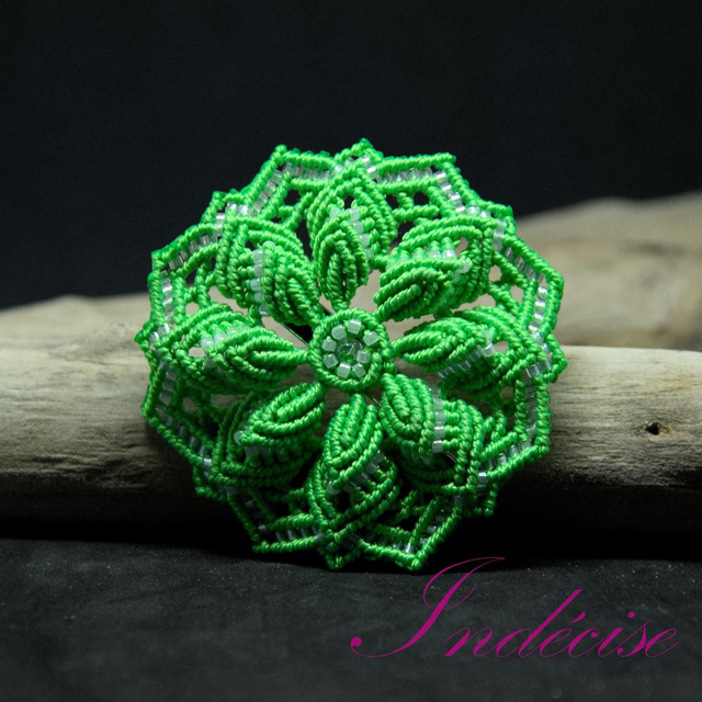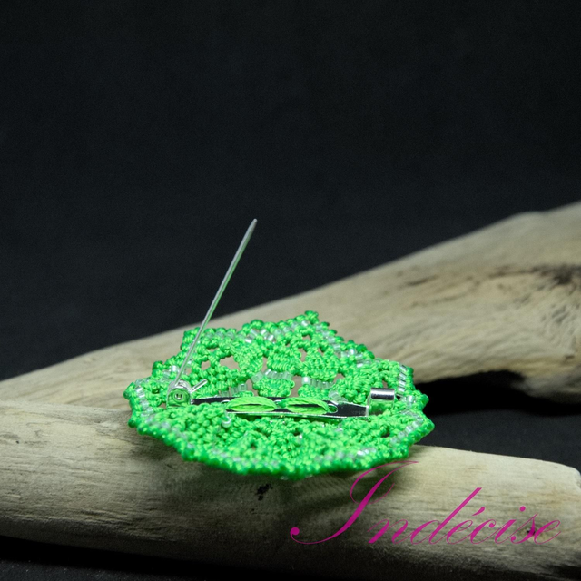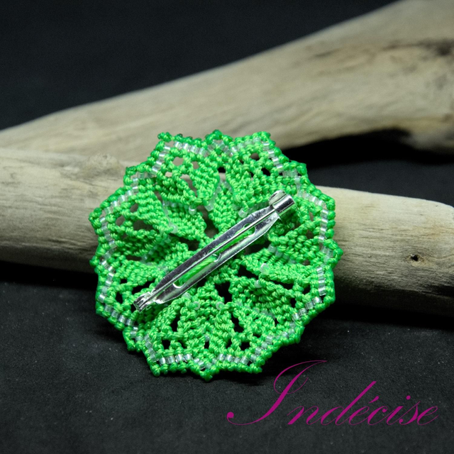 Broche mandala en macramé vert prairie avec perles cristal blanc - Diamètre : 5 cm environ - Création UNIQUE Indecise