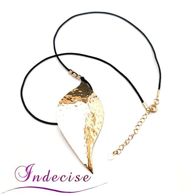 Collier pendentif feuille martelée et enroulée autour d'un cordon de polyester.