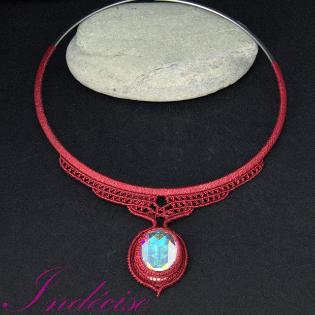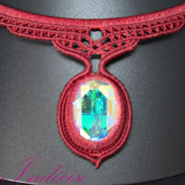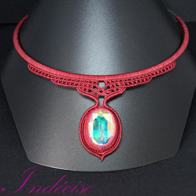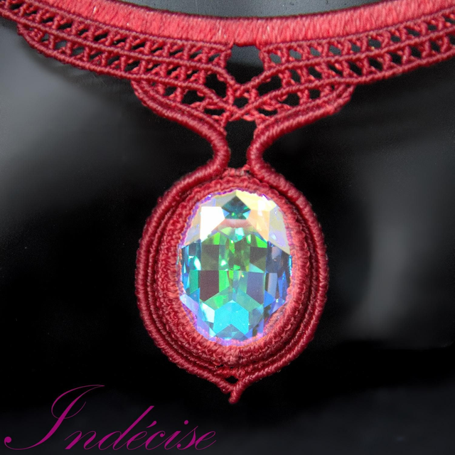 Collier en macramé, style ras de cou, pendentif en cristal AB serti en macramé rouge. Tour de cou en acier inoxydable (hypoallergénique). Fermoir par picot, facile à mettre et à enlever.