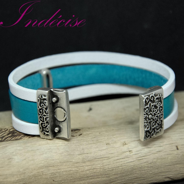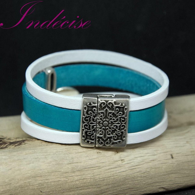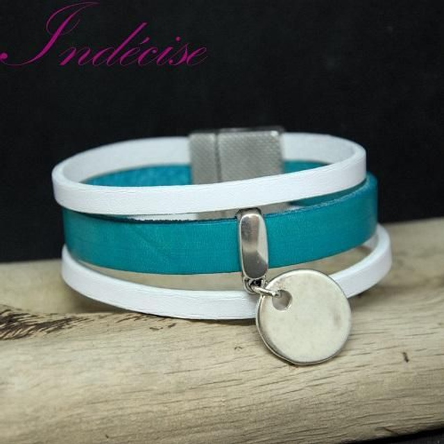 Manchette en cuir turquoise et blanc fermoir aimanté