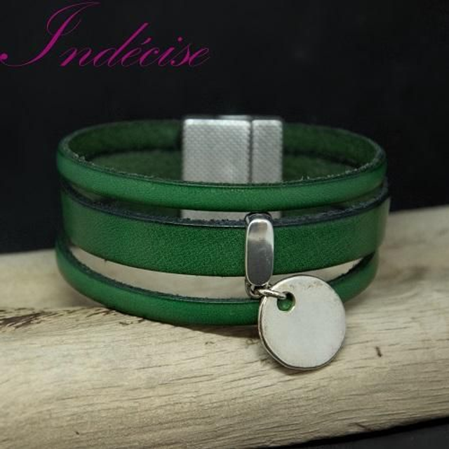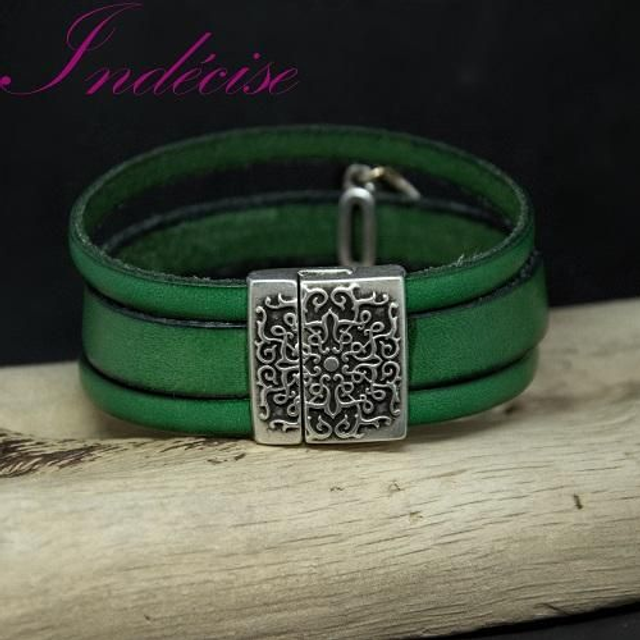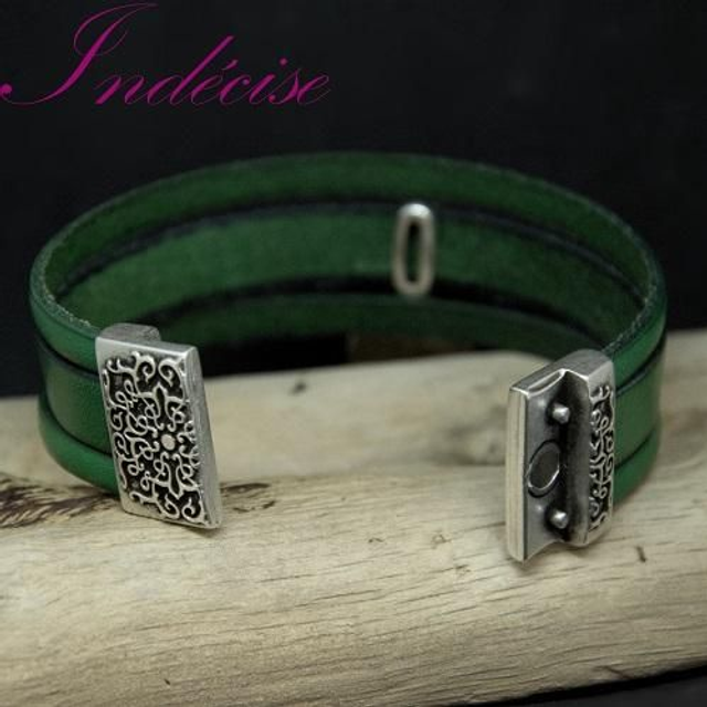 Manchette en cuir vert, avec fermoir ethnique en zamak (inoxydable, hypoallergénique) et passant en plaqué argent - Création UNIQUE Indecise