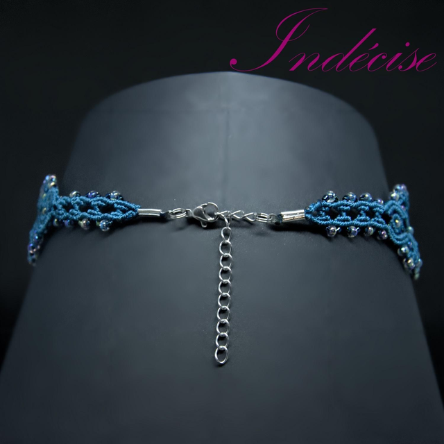 Collier, style ras de cou, en macramé bleu canard, avec perles irisées bleu - Longueur : 34 cm à 39 cm, avec chaînette d'ajustement de 5 cm - Largeur : 2,5 cm - Création issue de l'artisanat Français par Indecise - Livraison suivie offerte en France métropolitaine